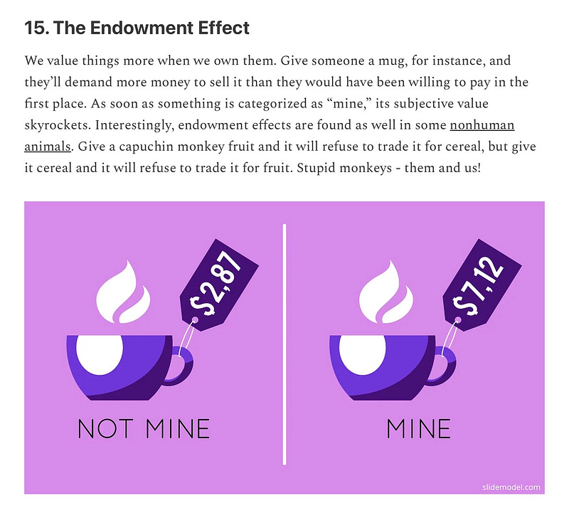"We value things more when we own them... Give a capuchin monkey fruit and it will refuse to trade it for cereal, but give it cereal and it will refuse to trade it for fruit."
