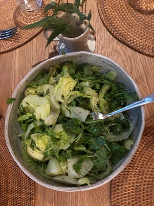 Ice burg lettuce and arugula is my current favorite salad. Dress with a little mustardy red wine vinaigrette, it’s perfect!