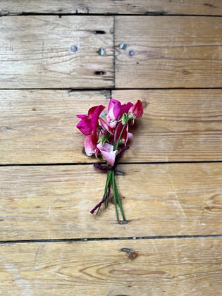 My first sweet pea posy (grown from seed) in the garden today is providing inspiration for a post about my experience of July flowers that is hopefully taking root in my mind and finding form on the page. I love sweet peas for their romance and whimsy.
