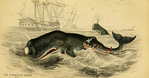 IMO the still beating heart of Moby-Dick is the ‘Grand Armada’ chapter, in which Ishmael encounters the mother whales and their calves, in a protected ring at the centre of a whale hunt. Something about Ishmael’s wonder, and the violence of the hunt, being so close together, breaks my brain/heart, and is just an extraordinary attentive description: ‘as human infants while suckling will calmly and fixedly gaze away from the breast, as if leading two different lives at the time; and while yet drawing mortal nourishment, be still spiritually feasting upon some unearthly reminiscence;—even so did the young of these whales seem looking up towards us, but not at us, as if we were but a bit of Gulfweed in their new-born sight. Floating on their sides, the mothers also seemed quietly eyeing us.’