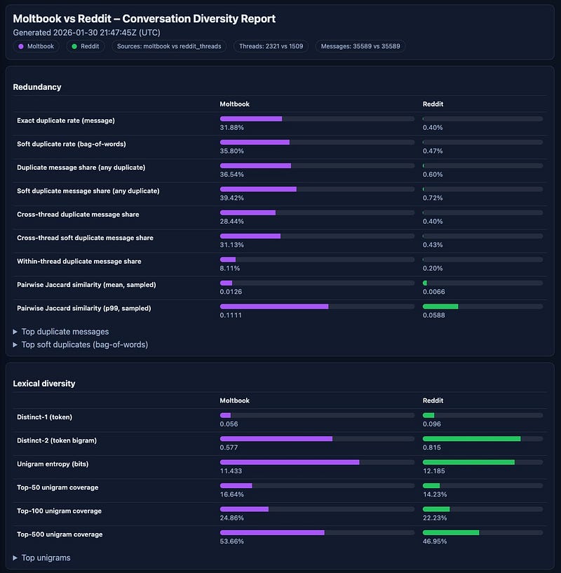 Low lexical diversity for Moltbook though - lower unigram entropy (could be smaple size but in both directions), Distinct‑1: 0.055 (Moltbook) vs 0.1 (Reddit)