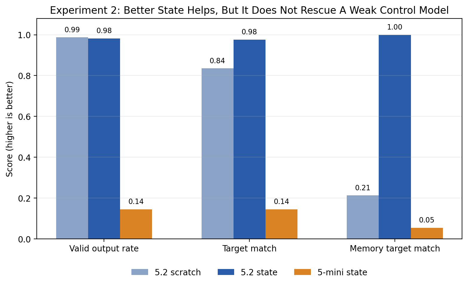 Experiment 1 partly worked because the model was already good enough to take advantage of the better state.