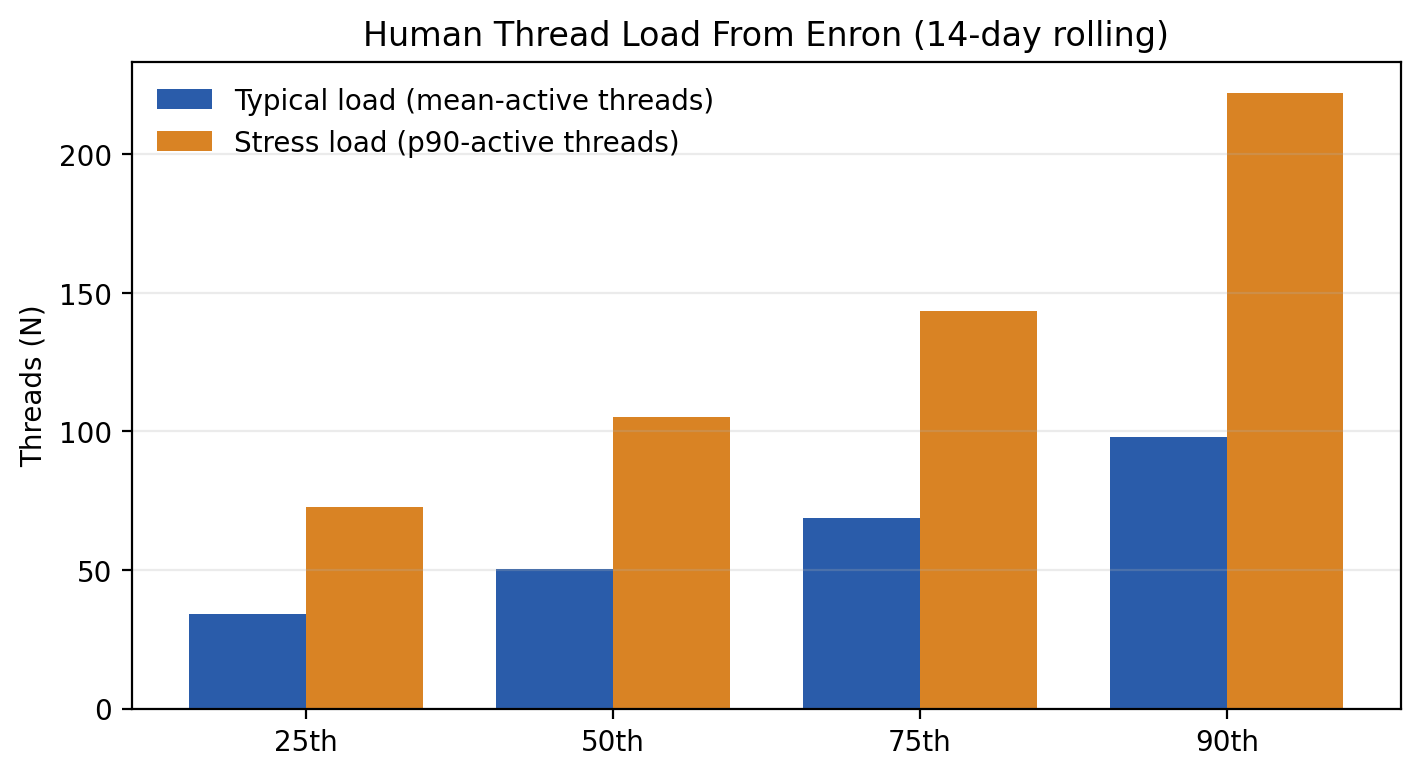 The Enron data is great by the way, I don’t know why it doesn't get more publicity! It shows for instance that human-realisitc inbox has like 50-100 concurrent threads, many of them with very limited context, and many of them requiring pretty good insight into the org to respond to. The volume predicts juggling strongly, and somewhat surprisingly seniority does not (once you control for volume).