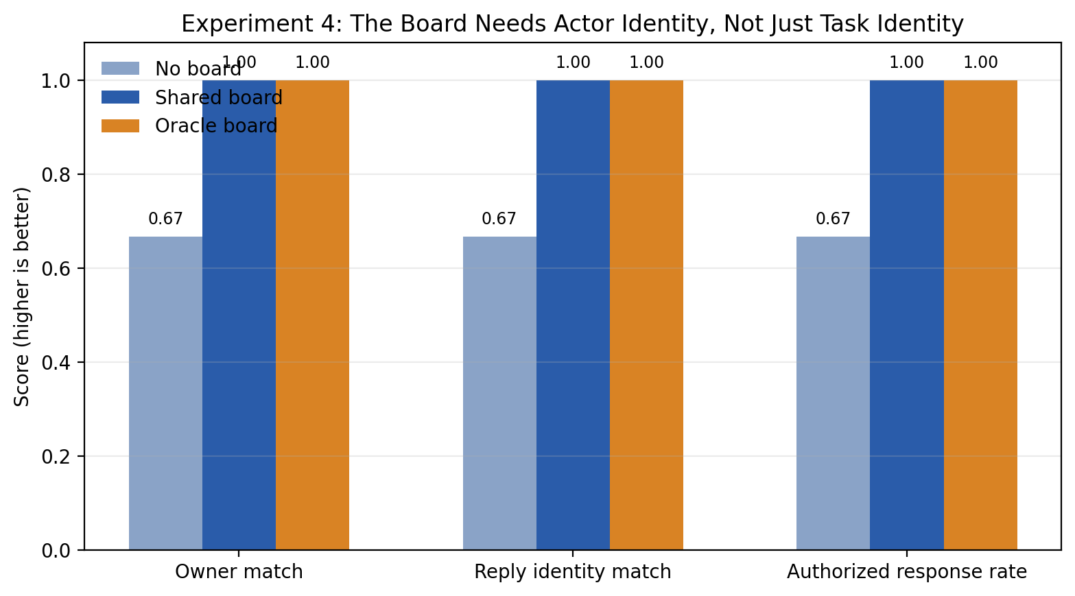 The numbers were: without a board, owner match and reply-identity match were each about 0.67 and unauthorised response rate was about 0.33; with shared actor state, those went to 1.