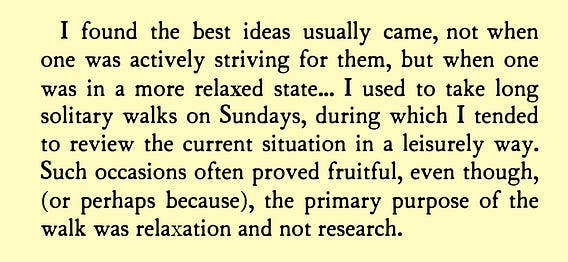 Paul Dirac (theoretical physicist who won the Nobel at 31, alongside Schrödinger) on when he gets his “best ideas”: