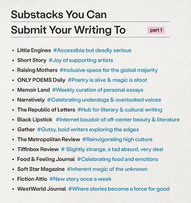 Wait you thought Substack was just a personal newsletter platform. Oh honey, WE π π½ GOT π π½ LOTS π π½ MORE. Here are some awesome Substacks that will publish your writing (I mean, if itβs real goodβ¦it is real good, right?)