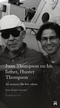 I became friends with Hunter over two very different decades— but in the end we grew close because of our children, and the prospect of “checking out.” This is my interview with his wonderful son, Juan Thompson, whose memoir is one-of-a-kind.