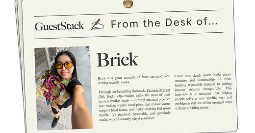 I love how clearly Brick thinks about structure and sustainability — from building repeatable formats to pairing income streams thoughtfully. This interview is a reminder that helping people solve a very specific, very real problem is still one of the strongest ways to build a writing career.