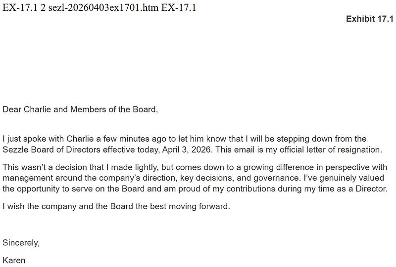 $SEZL. The 8-K is out. Karen Webster resigned on April 3, citing a difference in perspective with management on direction, decisions and governance.