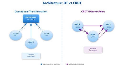Two competing philosophies dominate this space: Operational Transformation (OT) and Conflict-free Replicated Data Types (CRDTs). Google Docs uses OT. Figma switched from OT to CRDTs. Both solve the same problem differently, and understanding why reveals fundamental trade-offs in distributed systems that apply far beyond text editors.