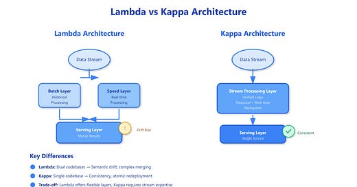 You’re processing millions of events per second—click streams, sensor data, financial transactions. Your Lambda architecture is running smoothly: batch jobs recompute historical views every few hours while a speed layer handles real-time updates. Then at 2 AM, you discover the batch and speed layers are calculating different results for the same metric. Your CEO is staring at conflicting revenue numbers. This isn’t a bug—it’s an architectural inevitability.