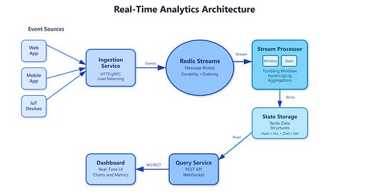 Real-time analytics architectures process unbounded streams of events as they arrive, computing aggregations, detecting patterns, and triggering actions within milliseconds. Unlike batch processing which operates on bounded datasets, stream processing treats data as continuous flows that never end.
