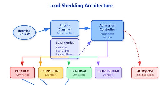 Your payment processing service is drowning. A bot attack floods your API with 50,000 requests per second—ten times your normal traffic. Meanwhile, legitimate users trying to complete checkouts are timing out. Your database connections are exhausted, CPU is pegged at 100%, and response times have degraded from 50ms to 8 seconds. The traditional approach—accepting all requests and letting everything fail slowly—creates cascading failures across dependent services. Load shedding is the counterintuitive solution: deliberately reject low-priority requests so critical operations survive.