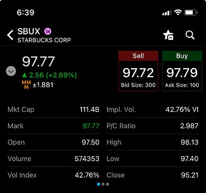 Ticker $SBUX ==> Short Sell Entry: 97.70$ Stop Loss: 106.00$