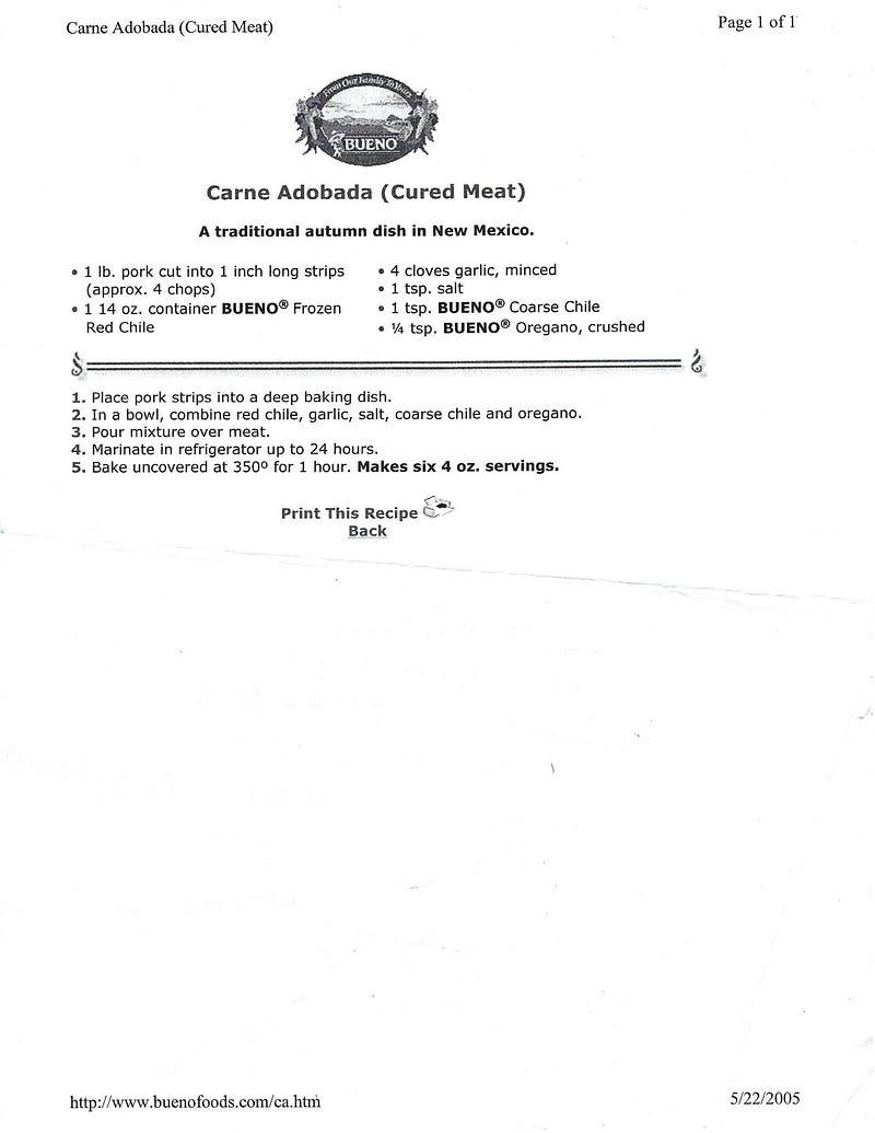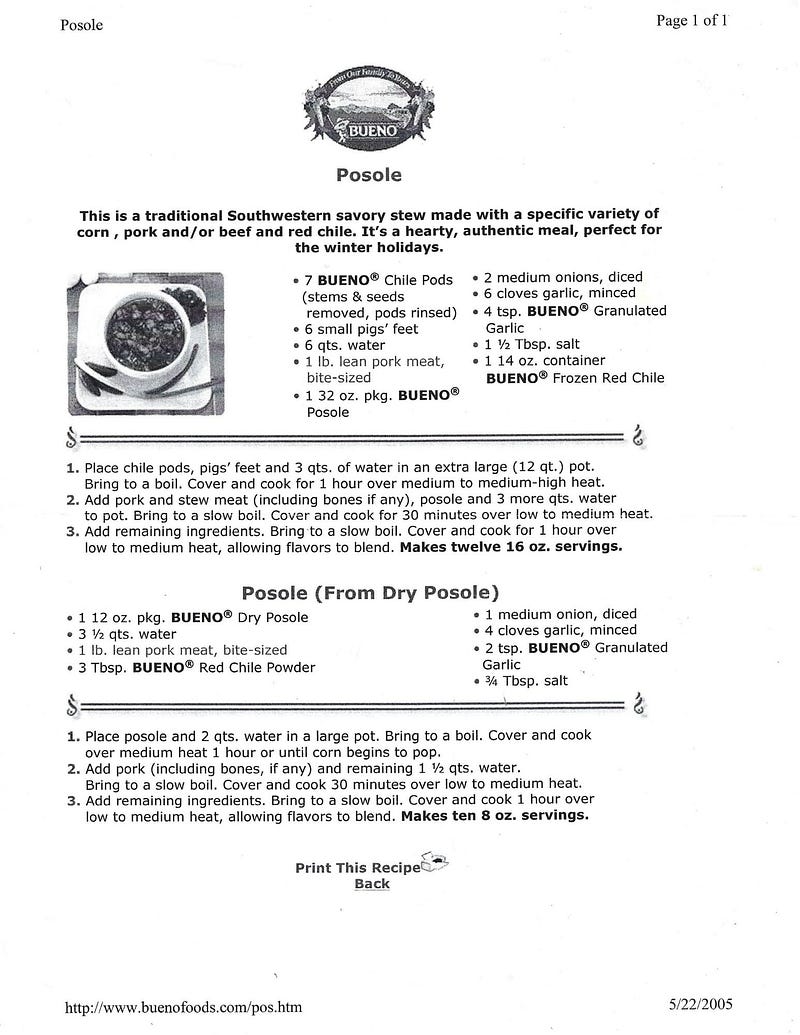 I printed them on 5/22/2005 from the Bueno Foods website. Decades ago when you were lucky if you found one page that felt like an actual recipe from home.