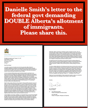 Danielle Smith's 2024 letter to Trudeau: Demanded Ottawa DOUBLE Alberta's immigration spots (20k+ annually) + 10k more for Ukrainians to fix 'critical labour shortages' and grow our economy.