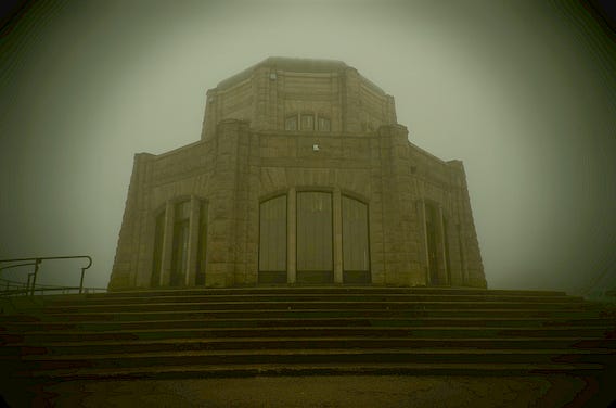 This photo reminds me of an old postcard. I drove up to Vista House from Portland, OR on a sunny day in January 2025 for the expansive view of the Columbia River Gorge only to find it completely socked in with dense fog.