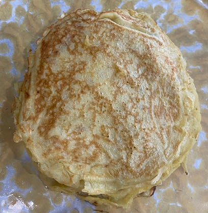 Several variations of these pancakes exist, but the following measurements result in a pancake instead of a bubbly egg that tastes like it's mixed with bits of banana: