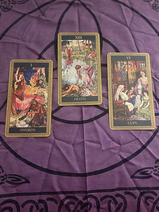 XIII Death - this card feels like it’s at the core of what’s going on; we are changing, transforming. With that process comes the destruction of the 10 of swords, and the renewal of moving forward; like spring after winter. Our old selves is gone, and we become something new.