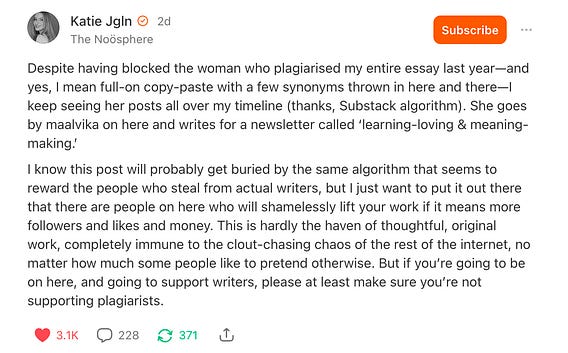 So this lady is just wholesale copy/pasting other people’s content then raking in money on her Substack. That’s super unethical and Substack should crack down on plagiarism and demonetize creators who engage in it.