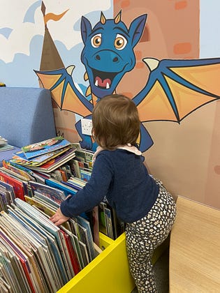 Just in the children’s section of our neighbourhood library, sitting on the floor, reading books with my daughter.