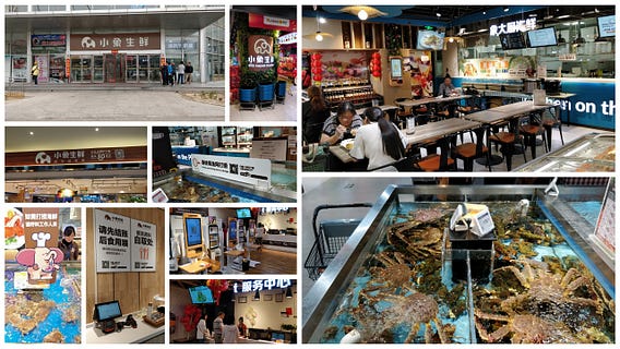 7Fresha and Xiao Xiang (literally ‘little elephant’) were clearly ‘inspired’ by Hema. But while the 7Fresh store at Dazu Plaza impressed the group, they were less enthusiastic about Xiao Xiang, which felt like a ‘poor man’s Hema’. Like Hema, it had a variety of seafood swimming in basins and offered home delivery through its app. But compared to Hema, it all just looked a bit shabby in the store.