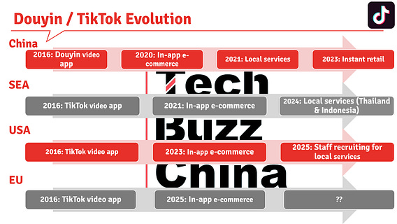 In Southeast Asia and now also in the US, we can see Bytedance, the parent company behind Douyin and TikTok, following the exact same roadmap. It started in-app local services in Indonesia and Thailand last year and is currently recruiting staff for a local services business unit in the US.