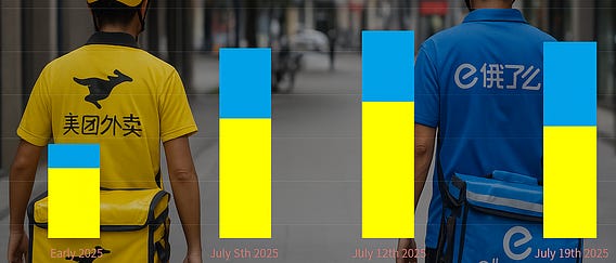 While Meituan and Alibaba continued their battle last weekend, neither company publicly released its results. According to Latepost, Meituan had 120 million orders on July 19th, and Alibaba's Taobao/Eleme had 90 million. As a result, the total number of orders more than doubled to this unsustainable level compared to Early 2025.
