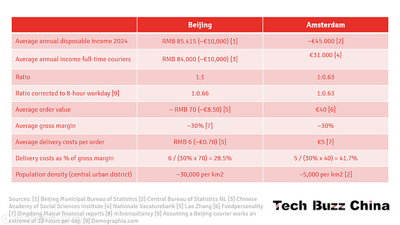 If we talk about labour costs, we actually need to realise that this is relative. While the absolute labour costs of delivery couriers are lower in China, so is the average disposable income of consumers. If we compare the average salary of a Beijing delivery driver to one in Amsterdam, the one in Amsterdam is actually earning LESS!