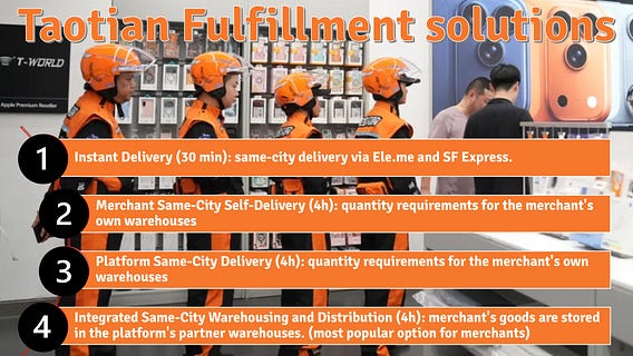 ▶️ Taotian (Taobao + Tmall) now offers merchants the fulfilment solutions in the image below. To achieve a 4-hour delivery time, at least one warehouse is needed in each city, which would require between 200 and 300 warehouses nationwide. At 30 30-minute delivery time, this would require tens of thousands of warehouses.