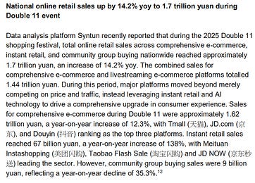 Sales during Double 11 grew by 14.3%. Two things that need to be mentioned here: 1) In the past, some market experts have questioned Syntun's data. 2) 2024 was a year of price wars, even resulting in e-commerce having a decreasing share in the retail market, so the increase in value doesn't say much about the increase in volume.