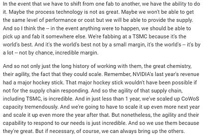 Jensen on Nvidia's ability to change fabs if needed - e.g. a geopolitical event happening around Taiwan.