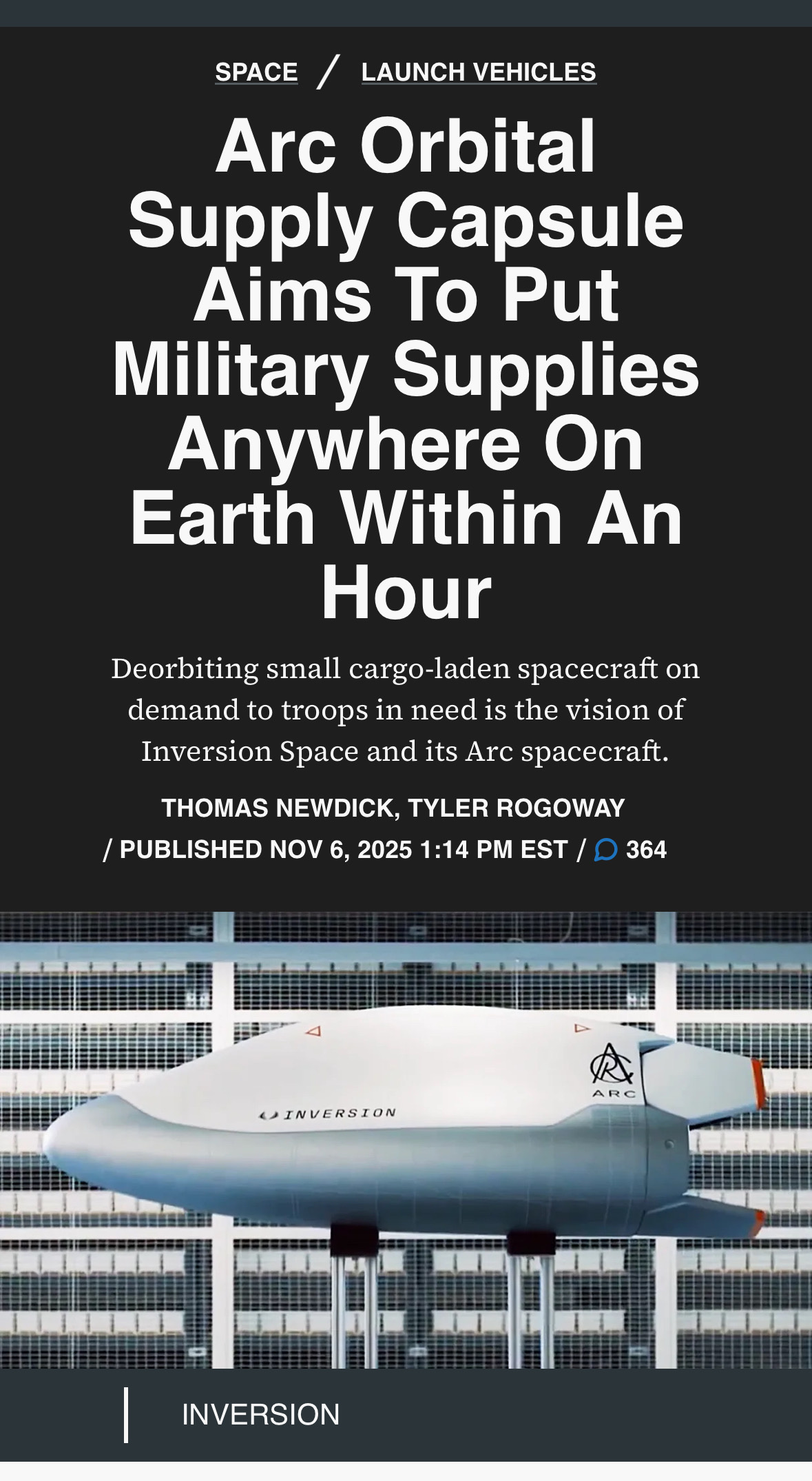 The Arc Orbital Capsule by Inversion Space is a floating body or reentry capsule that uses aerobraking and a parachute to re-enter and land. Inversion promises delivery of anything anywhere on Earth within an hour. While initially advertised for crisis response, the target market is obviously defense.
