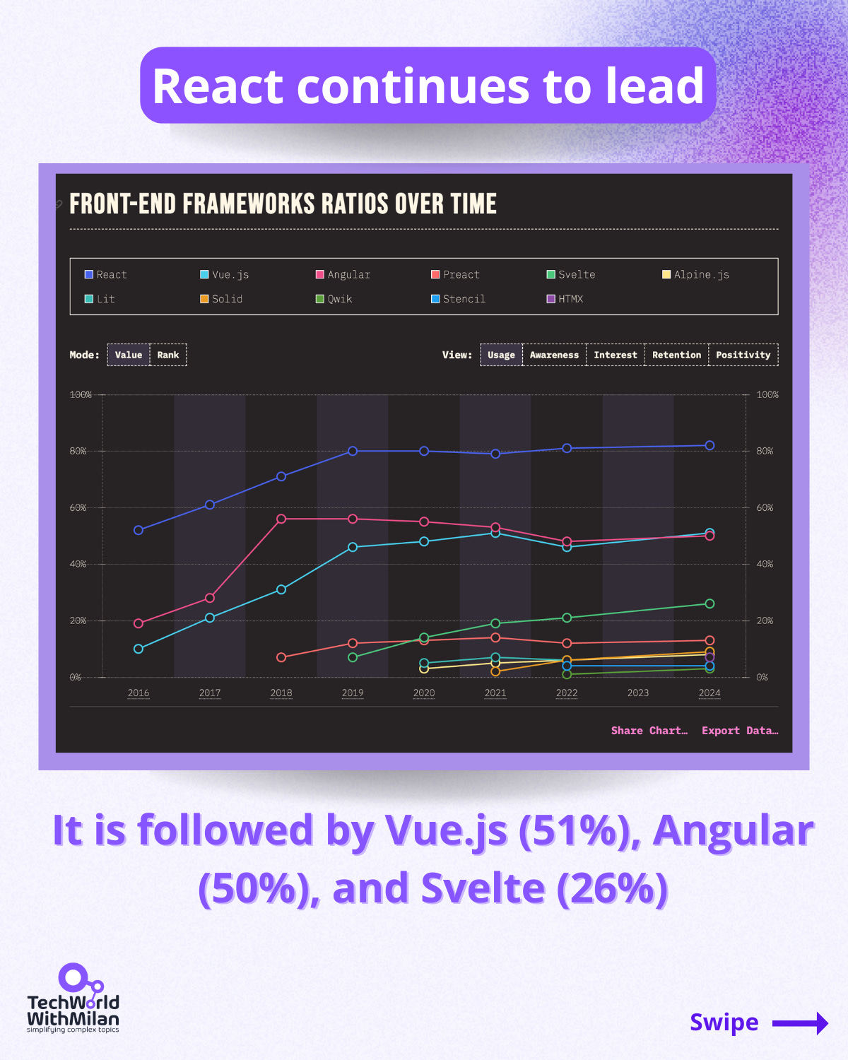 ✅ With 82% of respondents, 𝗥𝗲𝗮𝗰𝘁 𝗹𝗲𝗮𝗱𝘀 𝘁𝗵𝗲 𝗳𝗿𝗼𝗻𝘁-𝗲𝗻𝗱 𝗳𝗿𝗮𝗺𝗲𝘄𝗼𝗿𝗸 𝗰𝗮𝘁𝗲𝗴𝗼𝗿𝘆. It is followed by Vue.js (51%), Angular (50%), and Svelte (26%), which is gaining traction.