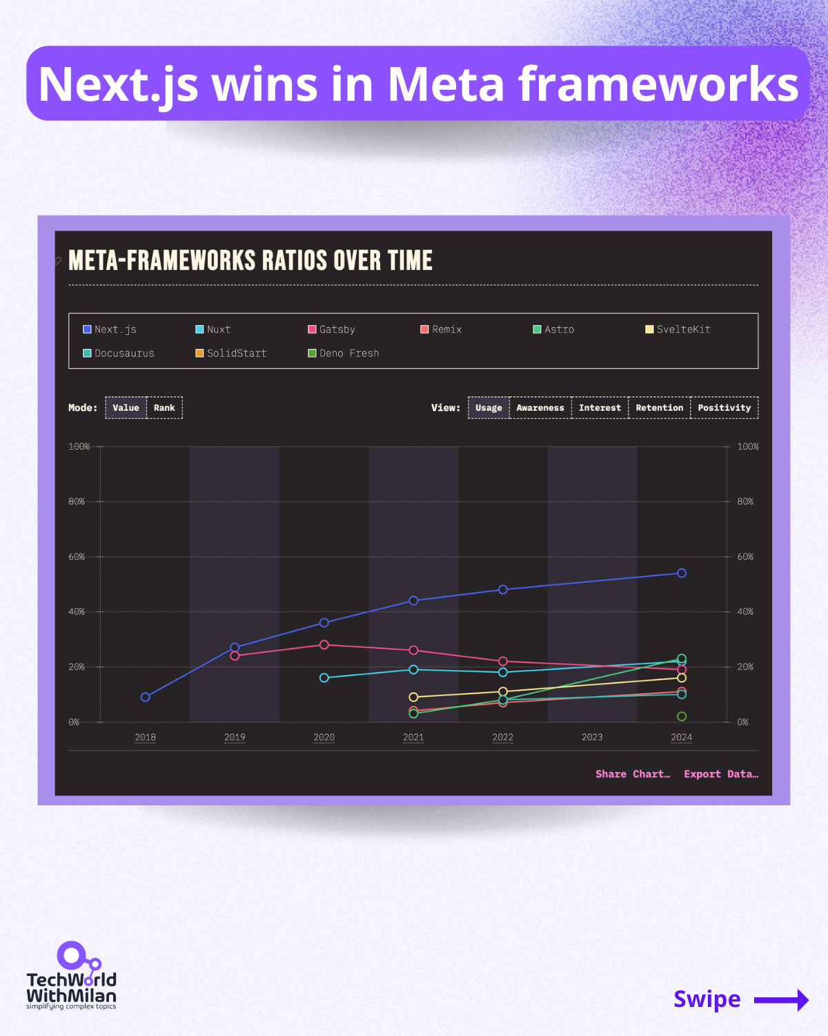 ✅ 𝗧𝗵𝗲 𝘄𝗶𝗻𝗻𝗲𝗿 𝗮𝗺𝗼𝗻𝗴 𝗺𝗲𝘁𝗮 𝗳𝗿𝗮𝗺𝗲𝘄𝗼𝗿𝗸𝘀 𝗶𝘀 𝗡𝗲𝘅𝘁.𝗷𝘀, which offers server-side rendering and static website development for React-based web apps. Although they are becoming more popular, newcomers like Remix, Astro, and SvelteKit still only account for somewhat less than 20% of respondents when it comes to usage.