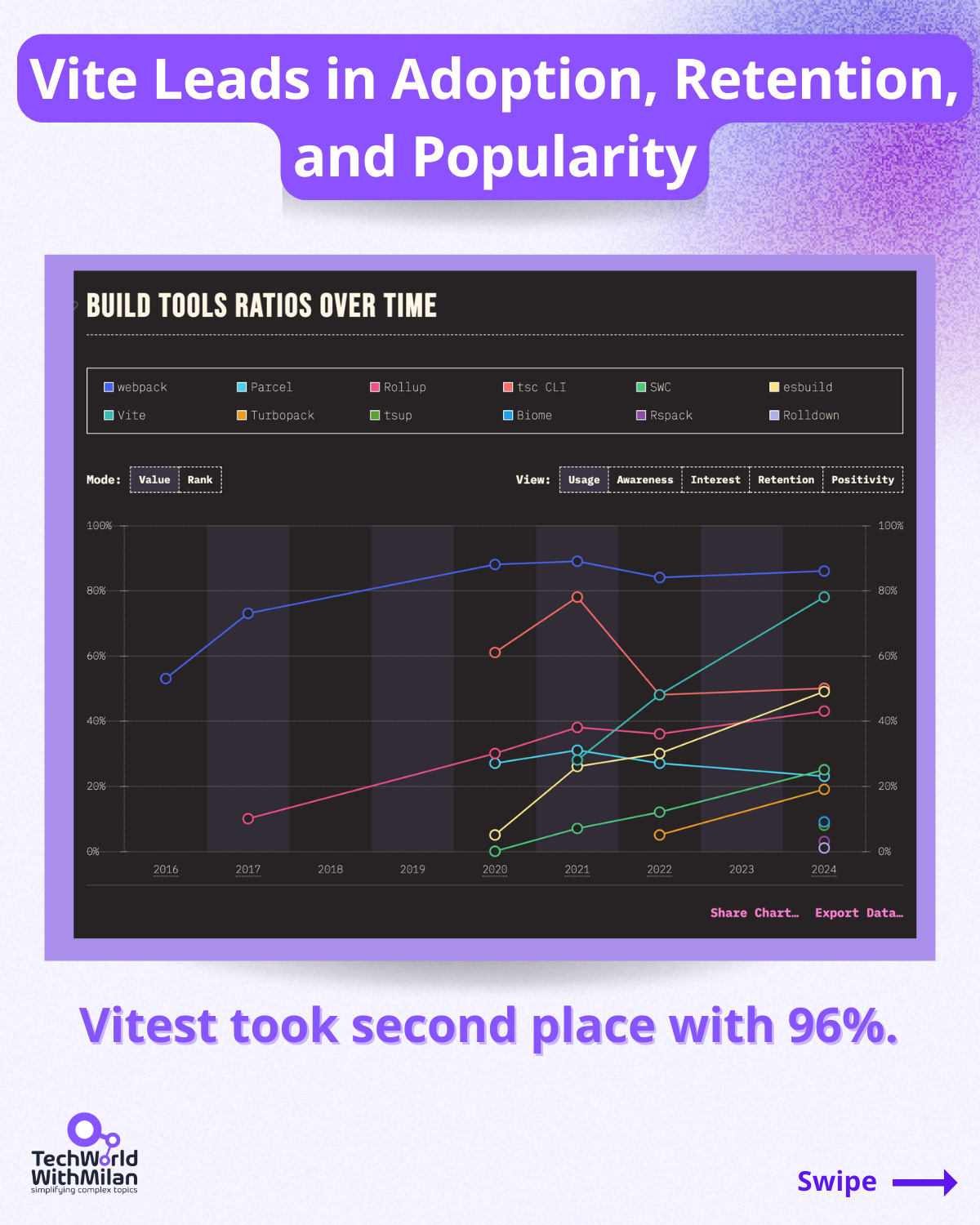 ✅ 𝗩𝗶𝘁𝗲, a local development server for modern web apps, took multiple prizes as the most adopted technology, with 69% of people using it.
