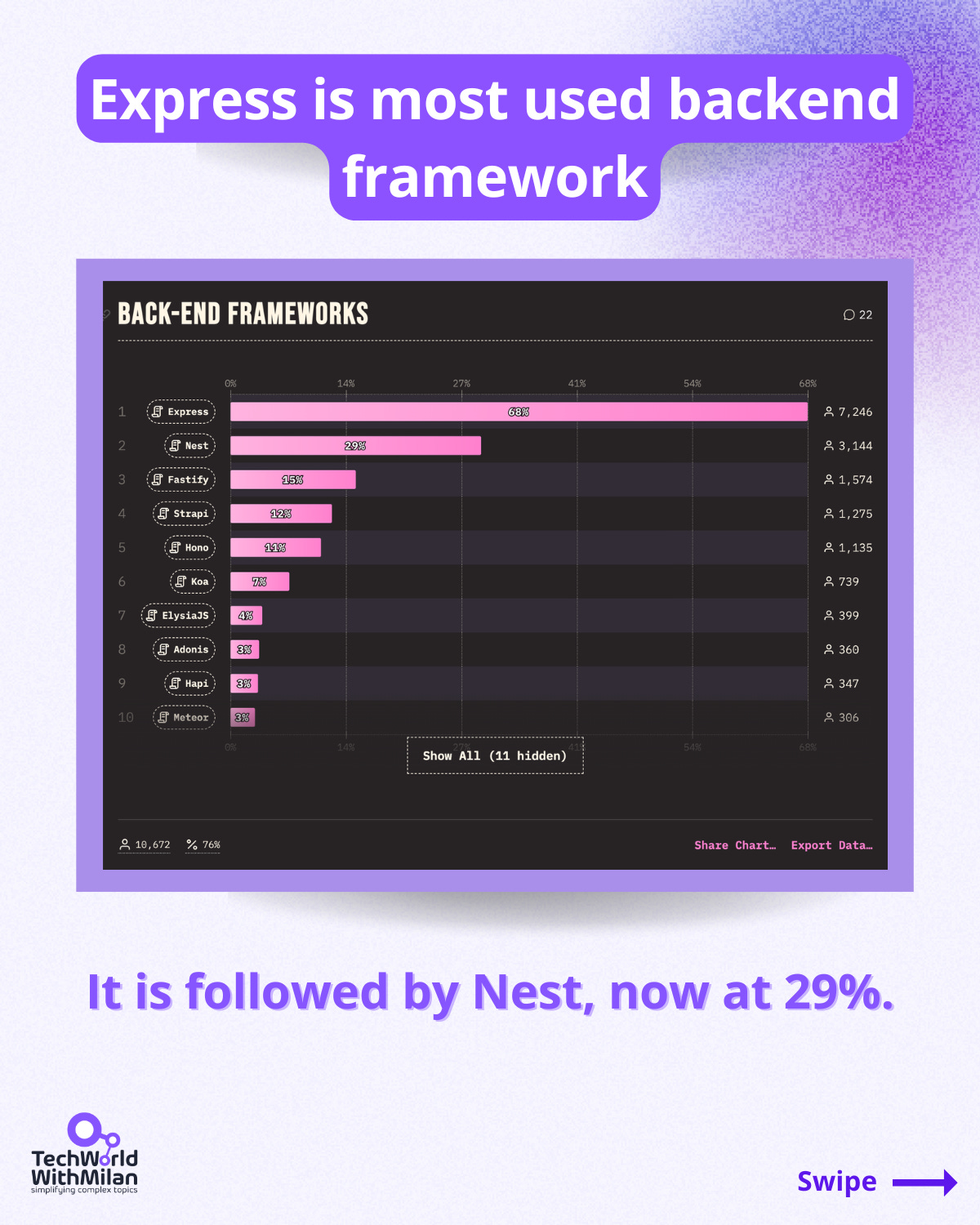 ✅ 𝗘𝘅𝗽𝗿𝗲𝘀𝘀 𝗶𝘀 𝘁𝗵𝗲 𝗺𝗼𝘀𝘁 𝗼𝗳𝘁𝗲𝗻 𝘂𝘀𝗲𝗱 𝗼𝗽𝘁𝗶𝗼𝗻 𝗳𝗼𝗿 𝘁𝗵𝗼𝘀𝗲 𝘂𝘁𝗶𝗹𝗶𝘇𝗶𝗻𝗴 𝗝𝗮𝘃𝗮𝗦𝗰𝗿𝗶𝗽𝘁 𝗼𝗻 𝘁𝗵𝗲 𝗯𝗮𝗰𝗸𝗲𝗻𝗱 (68% of responses), indicative of its enduring appeal and robust ecosystem. Nest is now at 29%.