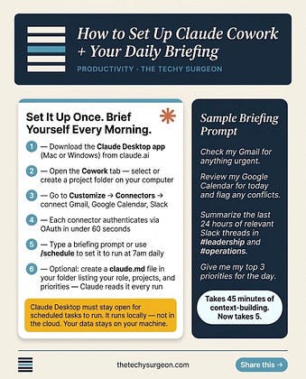 Claude Cowork can do all of it at 7am before you open your laptop — email triage, calendar conflicts, Slack summaries, top priorities — as a single structured briefing.