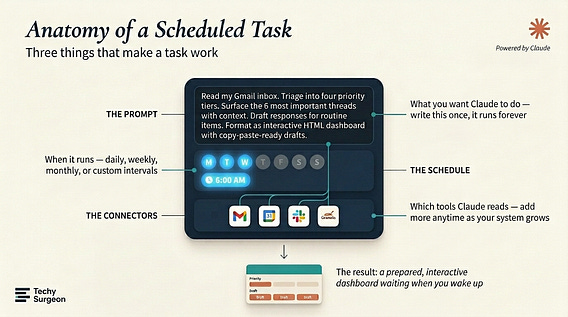 Scheduled tasks in Claude mean that as long as your computer is on and Claude CoWork open, you have a variety of tasks running autonomously and ascynchronously. And you can even ask Claude directly in the chat to make you a scheduled task by just describing what you want done. With MCP connectors and this, you have an agentic personal OS at your fingertips.