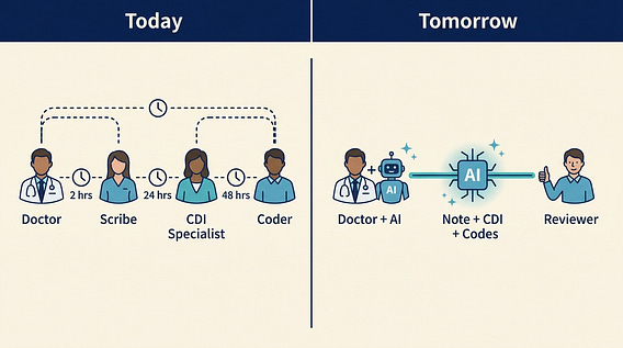 Today: doctor dictates → scribe writes note → CDI specialist reviews for documentation gaps → coder assigns codes. Tomorrow: ambient AI captures the encounter, generates the note, flags CDI opportunities in real-time, and pre-assigns ICD-10/CPT codes — all before the physician finishes signing. The human reviews and approves. Same quality. 80% less labor. This isn't futurism. It's Q4 2026.