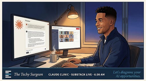 I’m doing a Claude Cowork session on Substack Live. Working through real workflows and a bit of a set up — clinical examples, operational, writing — and showing how I’ve structured Claude as leverage for my personal and professional life.