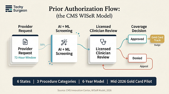 The WISeR Model is live. As of January, CMS is running AI-assisted prior authorization in six states for three procedure categories: skin substitutes, nerve stimulator implants, and knee arthroscopy for osteoarthritis. The agency promises 72 hour coverage decisions and appropriately licensed clinician review on every denial. Here's the part worth watching: CMS plans to pilot a “goldcarding” feature by mid-2026 exempting providers with consistent approval histories from future prior auth requirements entirely. That's a genuinely interesting incentive design. Reward clean practice patterns and remove friction for the providers who don't need oversight. The tension is structural. AI-assisted prior auth is either a precision tool for reducing low-value care or a scalable mechanism for denying claims faster. The answer depends entirely on implementation, transparency, and whether "evidence-based" means the same thing to CMS's algorithm as it does to the surgeon holding the scalpel. Six states. Six years. Three procedure categories. This is how policy experiments begin.