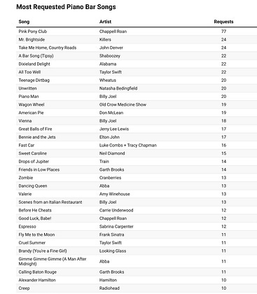 Here’s a list of the most requested piano bar songs (courtesy of Chris Dalla Riva and Jesse Rifkin). A fascinating mix.