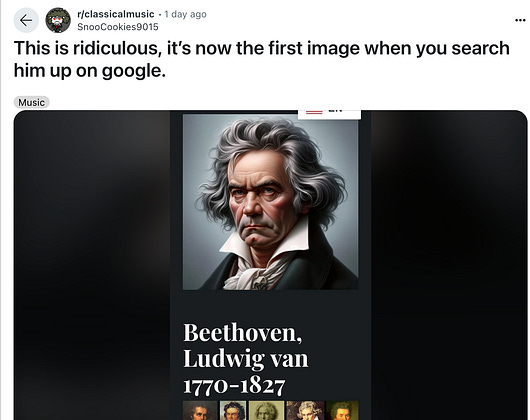 Just to be clear, accurate portraits of Beethoven exist, and are easy to find. But the AI worshipers at Google hardly care about that—they prefer digital schlock because, hey, that's now their business.