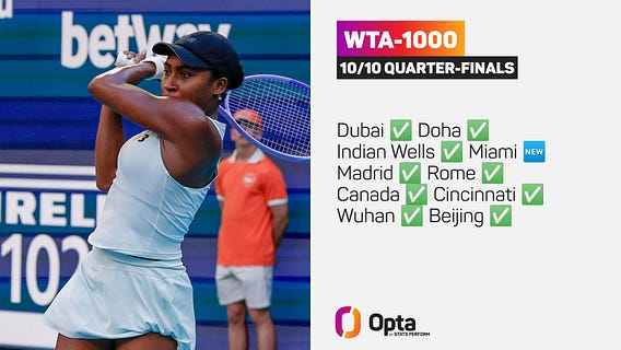 By defeating Sorana Cirstea 6-4, 3-6, 6-2 in the Miami R16, Coco Gauff became the youngest player to reach the quarterfinals in all 10 current WTA-1000 events.