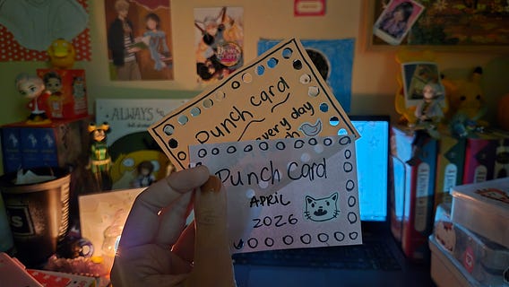 Usando um papelzinho e um furador para registrar os dias em que estudo japonês. No papel, não me comparo com ninguém e ainda me divirto fazendo os furinhos.