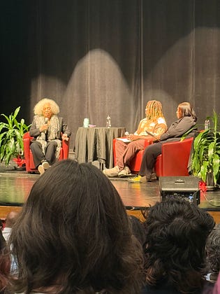 Angela Davis was at Virginia Tech today (no thanks to the university), and the moderators were two people I love and value deeply. One is a brother & mentee (his words) of mine; the other is a teacher and mentor (my words) of mine. I can’t put into words rn how beautiful this was to see. Not because of what was shared — though I appreciated a good deal of what Dr. Davis said, especially given the crowd. It was beautiful because of all that was behind it. The immediate work and push my bro did to make it possible, the organizing and culture-shifting work many of us have been doing for about 3 years on campus, and how much my teacher has inspired that work with the skills and lessons shes offered so many of us. I want to write about these things down the line, inshallah.