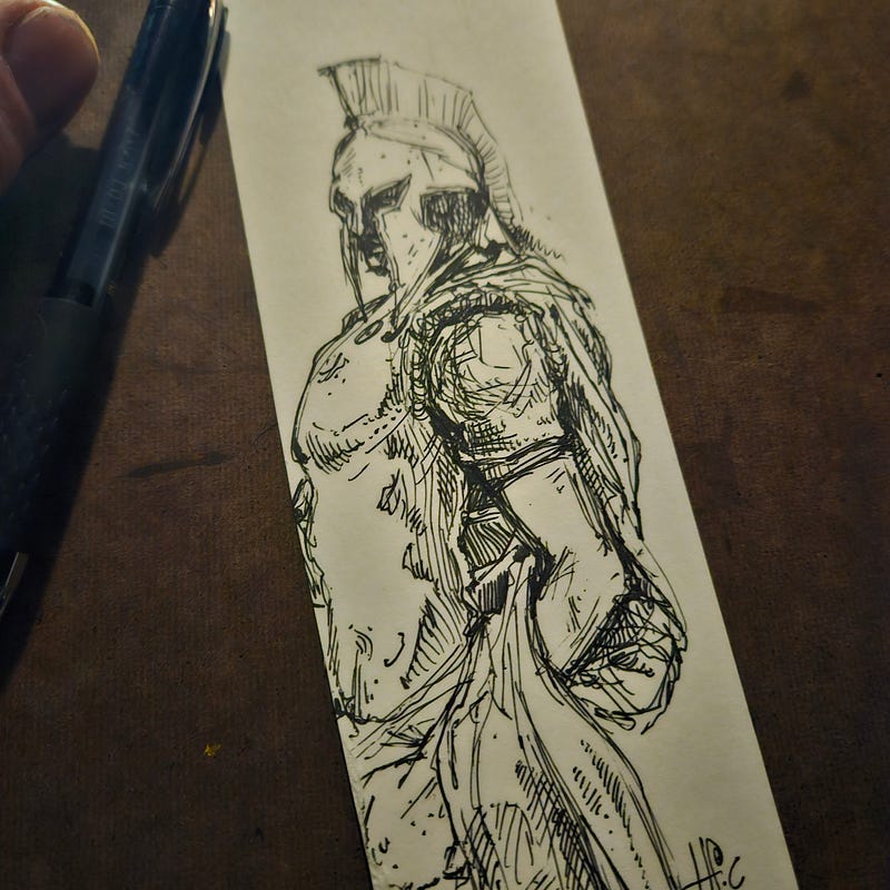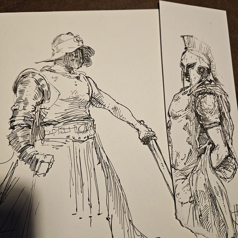 Today's sketch, a late night side quest on paper scraps, because Meditations On Permafrost has my mind in ancient days: