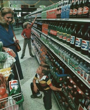 Grocery shopping in 1980, when every soft drink bottle on the shelf was still made of glass.