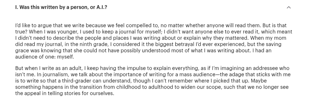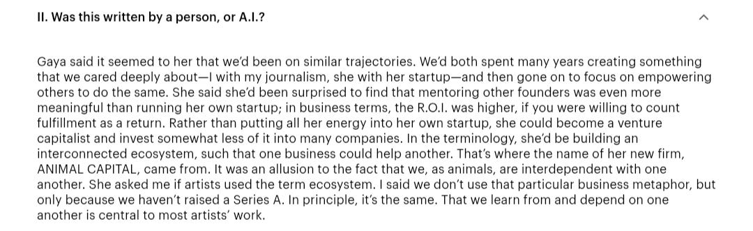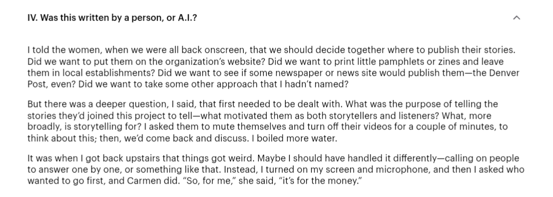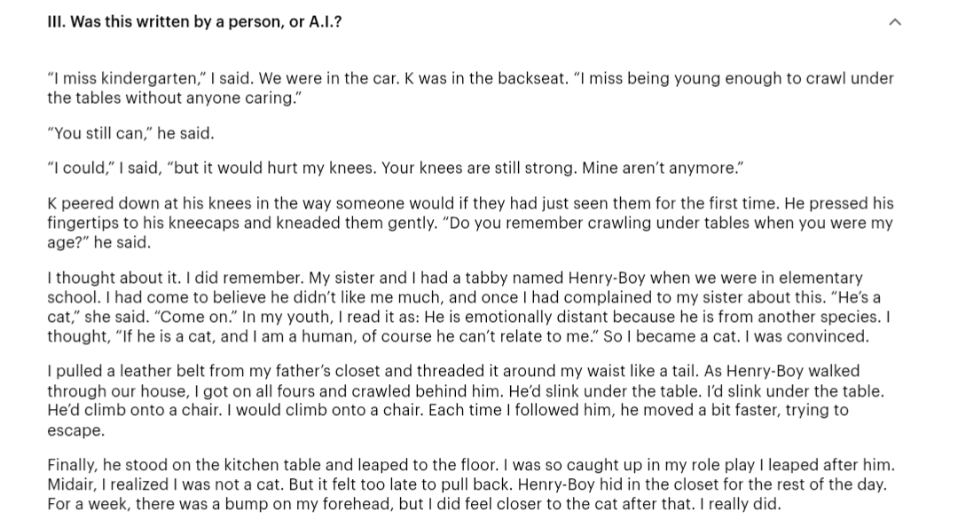 I'm reading Vauhini Vara’s latest for the New Yorker, What if Readers Like A.I.-Generated Fiction?, and identified correctly the two AI passages and two of her own, whereas professional writers who know her work much better than I do failed completely. I didn't hesitate; to me there are two passages that are clearly human (not just hers …